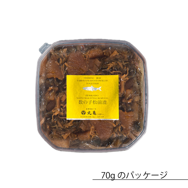 | 原材料名 | 数の子(ロシア)、するめ、しょうゆ、昆布、還元水飴、砂糖、発酵調味料、醸造酢/ソルピット、調味料(アミノ酸等)、酒精、増粘多糖類、甘味料(ステピア)、色料(黄5)、(一部に小麦・大豆・いかを含む) |