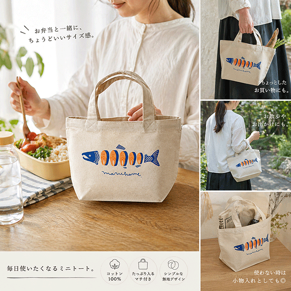 ユニークな鮭のイラストが目を引く、ナチュラルなミニトートバッグです。
