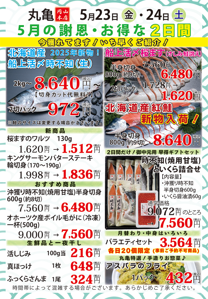 【主な出店商品】 【今獲れてます!】(生)時不知一本物・切身・活〆桜ます(さしみ鮭誂え) 各種・北海道産紅鮭 各種・【新商品】桜ます円舞曲・キングサーモンバターステーキ・【2日間だけ!早得ギフト】時不知(焼用甘塩)といくら詰合せ【お惣菜】アスパラのフライ 他