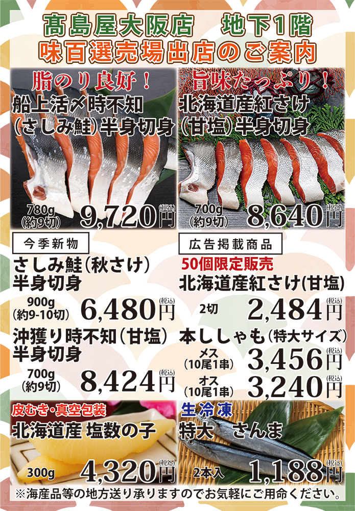 【主な出店商品】  活〆時不知(さしみ鮭)半身切身・北海道産紅さけ(甘塩)半身切身・【今季新物】さしみ鮭(秋さけ)半身切身・【広告掲載品】北海道産紅さけ(甘塩)2切・本ししゃも(メス、オス)・北海道産塩数の子・生冷さんま 他