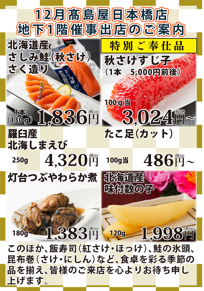 【主な出店商品】 さしみ鮭(秋さけ)さく造り・秋さけすじ子・羅臼産北海しまえび・たこ足(カット)・灯台つぶやわらか煮・味付数の子 他