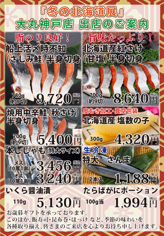 【主な出店商品】 船上活〆時不知(さしみ鮭)半身切身・北海道産紅さけ(甘塩)半身切身・焼用中辛鮭(秋さけ)半身切身・北海道産塩数の子・ししゃもオス・メス(特大サイズ)・特大さんま 他