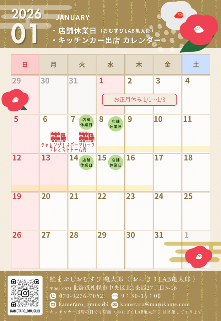 【鮭まぶしおむすび亀太郎 1月の休業日とキッチンカー出店にスケジュール】 2026年 1月の休業日は7日(火)・8日(水)/14 (火)・ 15 日(水) となっております。ご来店の際は、ご注意ください。