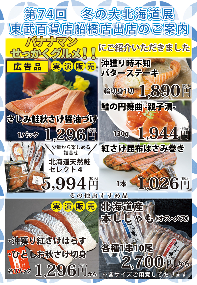 【主な出店商品】 【バナナマンせっかくグルメ!!にご紹介いただきました】さしみ鮭秋さけ醤油づけ・沖獲り時不知バターステーキ・鮭の円舞曲・紅さけ昆布はさみ巻・本ししゃも 他