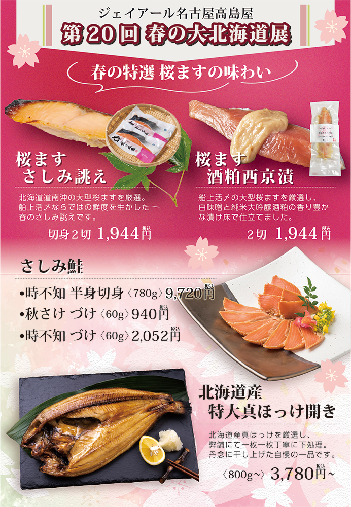 【主な出店商品】 桜ますさしみ誂え2切・桜ます酒粕西京漬2切・さしみ鮭時不知半身切身・秋さけづけ・時不知づけ・北海道産特大真ほっけ開き 他