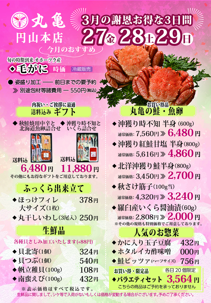 【主な出店商品】 オホーツク海毛がに(冷蔵販売)・送料込みギフト・ほっけのフィレ・貝北寄・あさり・帆立稚貝・南蛮えび・丸亀の鮭・魚卵・【手造りお惣菜】かに入り玉子豆腐・ホタルイカ酢味噌 他