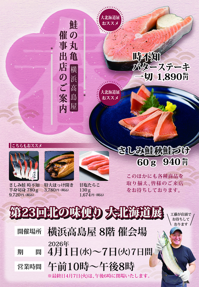 【主な出店商品】 時不知バターステーキ・さしみ鮭秋さけづけ・さしみ鮭時不知半身切身・特大ほっけ開き・甘塩たらこ 他