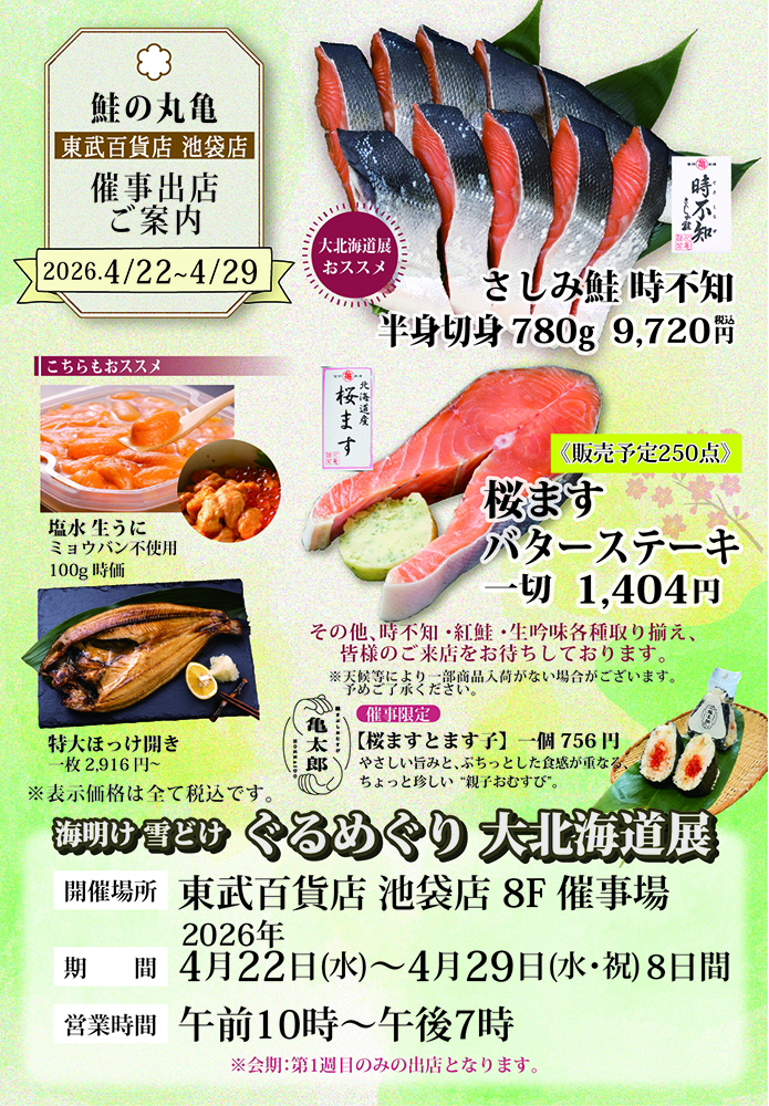 【主な出店商品】 ささしみ鮭時不知半身切身・桜ますバターステーキ・塩水生うに・特大真ほっけ 他、【亀太郎】桜ますとます子おむすび 一個756円 他