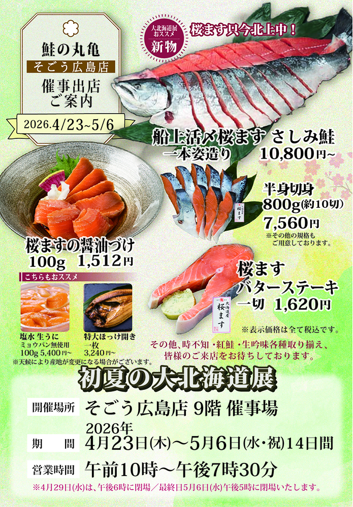 【主な出店商品】 船上活〆桜ますさしみ鮭一本姿造り・桜ます半身切身800g~・桜ますバターステーキ・桜ますの醤油づけ・塩水生うに・特大真ほっけ 他